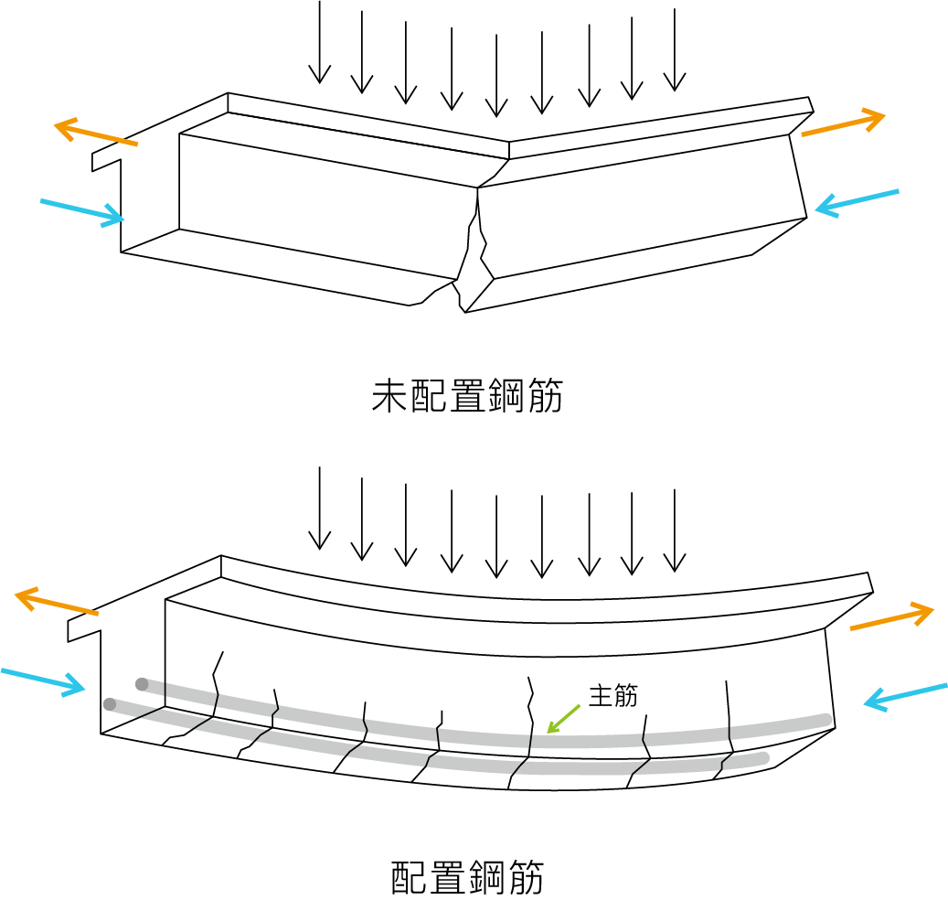 抗拉性佳及抗壓性差的鋼筋,與抗拉性差及抗壓性佳的混凝土結合,正能夠使兩種建材互補長短。在混凝土受拉處配置鋼筋,就可以彌補混凝土抗拉性差的缺點,當承重壓力過大時,混凝土雖然仍會裂開,但鋼筋可以串起裂開的混凝土,同時發揮鋼筋的高延展性。