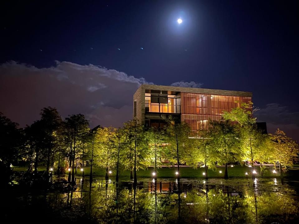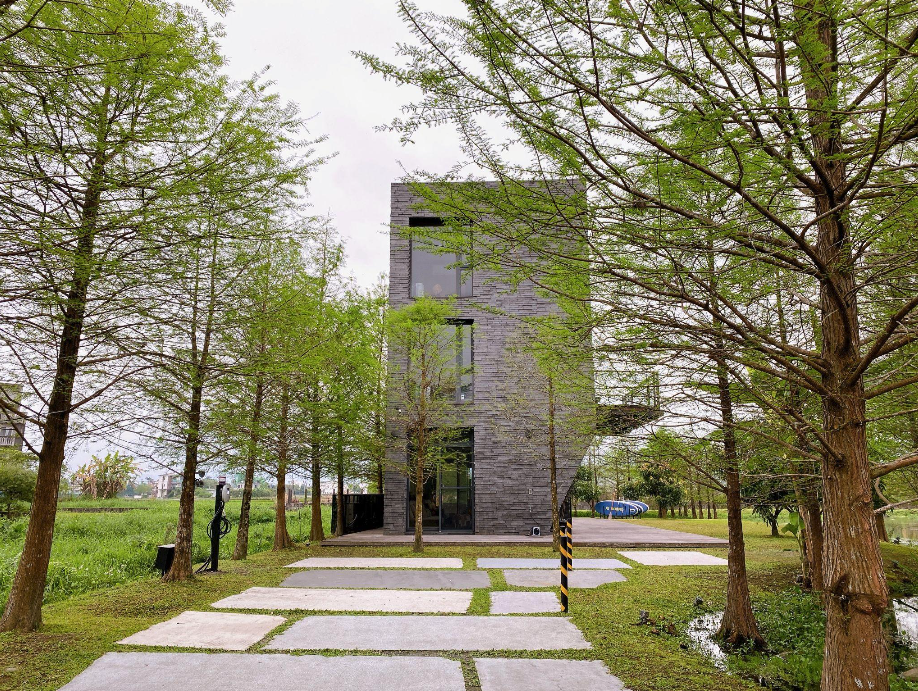 抵達 HA house 秋,放眼望去是一池由地底冒出的天然湧泉在流動,水裡還伴著一棵棵佈滿大地色彩的落羽松,HA house 秋 展現活著的建築充滿生命力的樣貌,靜靜的融合於自然之中,有鳥叫聲、湧泉潺潺流著、青青草地香味隨微風陣陣香,原來離市區10分鐘就能有住在擁有世界級自然美景裡的生活。