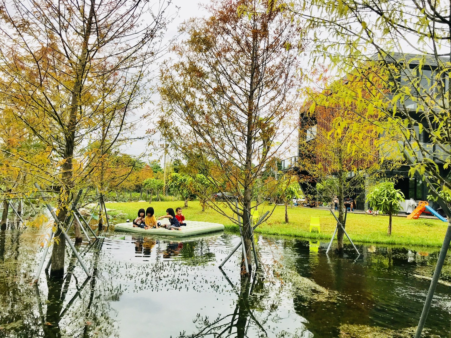 HA house 秋 內外觀看都是完全開放的視野,一望無際又帶有豐富綠意的層次,座落在清淺的湧泉池環繞的緩坡綠地上,鐵木鋪成木棧道般的梯形木平台所環繞,大人小孩都能光著腳丫感受木頭的溫暖席地而坐、在小斜坡上躺著看藍天與被落羽松包圍,Spun Chair 陀螺椅更提供大家體驗360度笑著觀賞自然景觀。