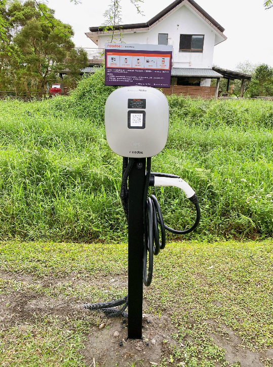 請直接將車開入庭院,停車時請小心避開警示柱(黑黃條紋),HA House 秋 配置1座 Noodoe 充電樁,請依照充電樁上方指示進行充電與付費。