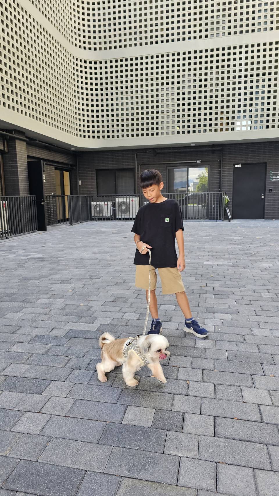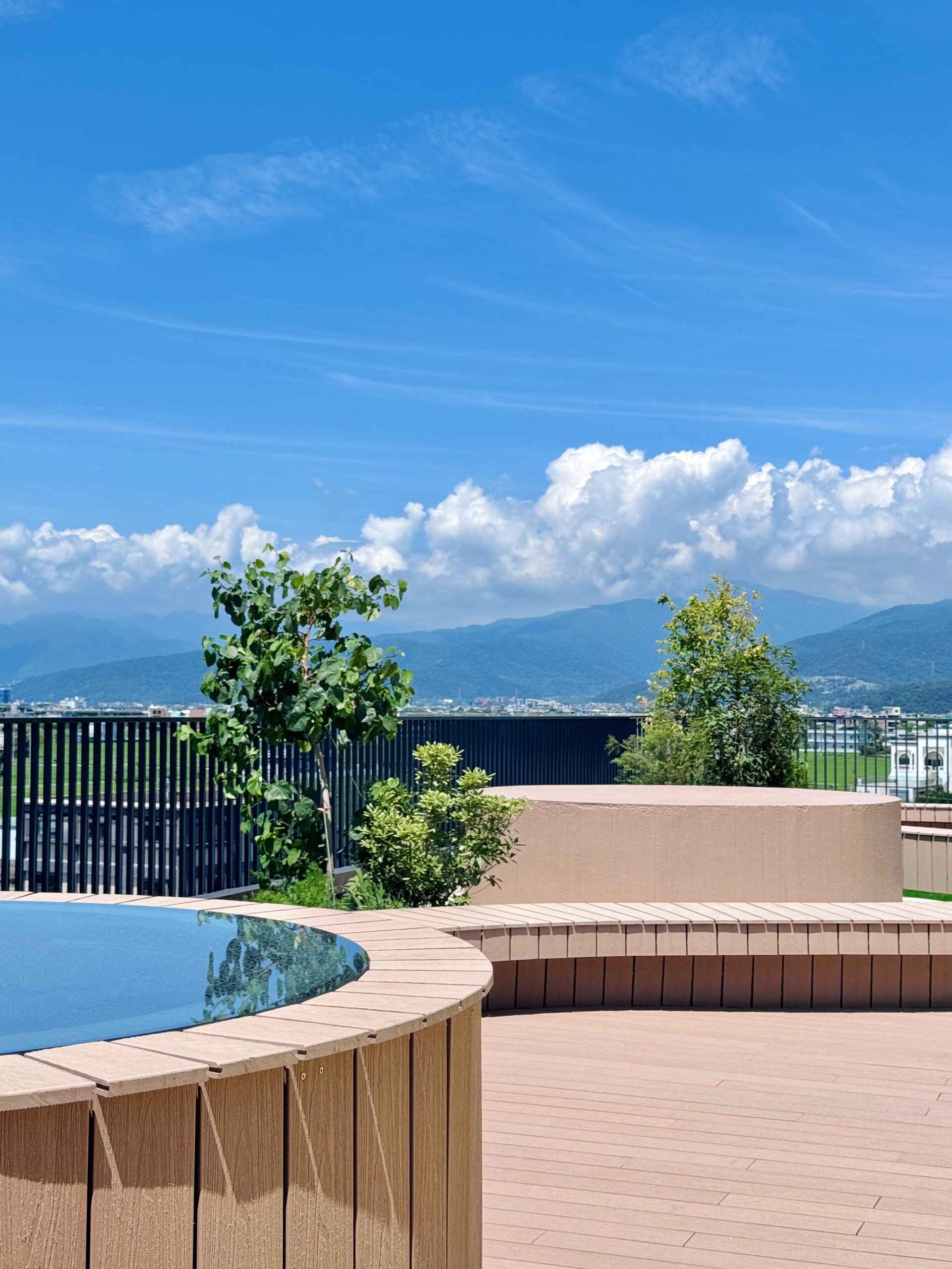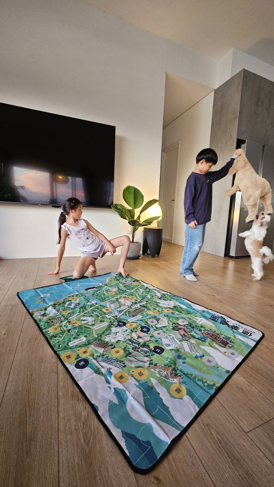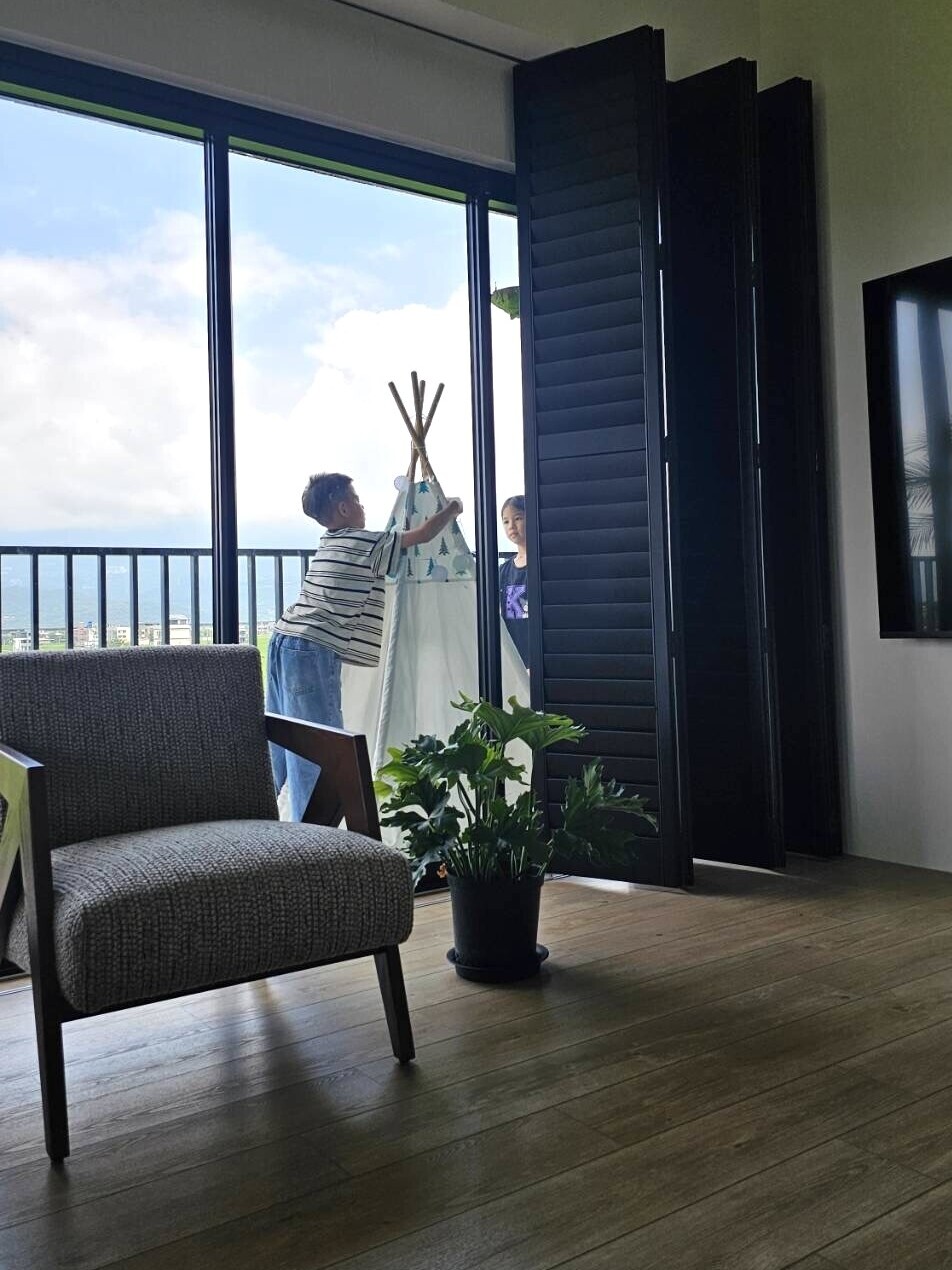 空間的開闊,讓孩子有很多自然長出來的玩法。夏天可以到頂樓玩噴水、打水仗;陽台可以充氣變成小泳池;樓上能跑步、曬太陽;朋友來時,不只在家裡玩,還能延伸到樓下公設一起露營、一起追跑。Amanda 提到一幕她非常喜歡的畫面:遛狗回家時,狗狗一穿過柵欄就會自己開始起跑,孩子也跟著衝出去,她站在樓下笑著錄下那個瞬間。那樣的快樂,不是刻意安排出來的,而是環境本身就容許這些事情發生。