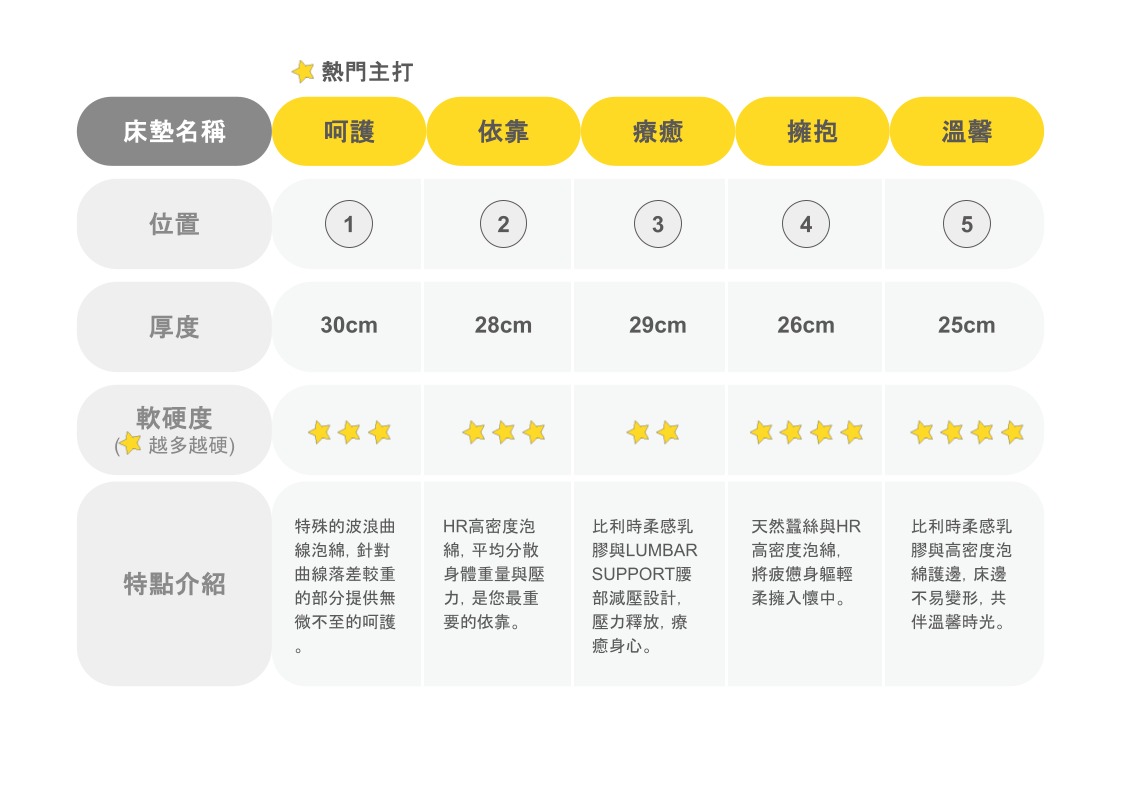 德築獨家訂製床墊共五款:呵護、依靠、療癒、擁抱、溫馨