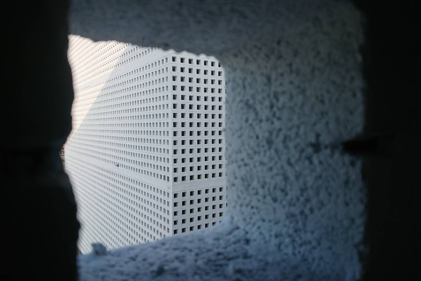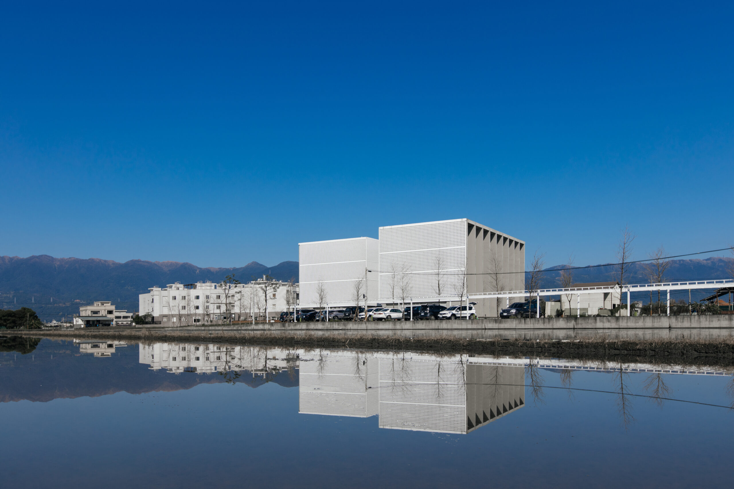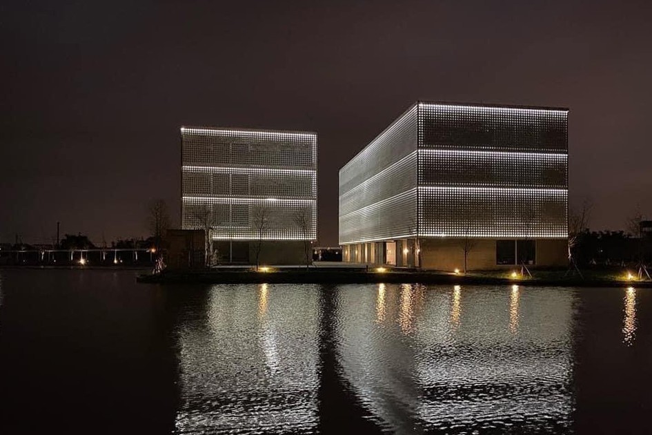 築田運動生活村採用複層式空心磚外牆設計,在距原外牆約70-80公分處再設計一層外牆,以空心磚呈現,陽光將會直射在空心磚上,而空心磚與建築物外牆之間形成空氣層,熱會在空氣層中被對流帶走,不僅室內通風涼爽、隱私兼具,空心磚的俐落線條也使建築顯得摩登又時髦,當日出或傍晚時分,自然光穿過空心磚灑入室內,產生迷人的矩形光影變化,創造豐富的視覺饗宴與帶出空間的層次感。