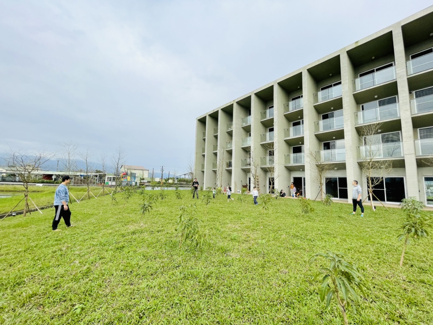 築田佔地廣闊,四周大樹環繞,沿著車道陸續抵達社區內,右手邊是在夏季會變身為金黃色的稻田,左手邊是會隨著春夏秋冬變化迷人樣貌的落羽松,最側邊則是可以挖土堆土活動筋骨創造自己的開心農場,種得開心也吃得安心,而建築物西側草坪景觀區則是種滿巴西地毯草,適合在傍晚時分野餐烤肉看星星、小孩也可以在這裡奔跑玩耍創造快樂童年回憶。