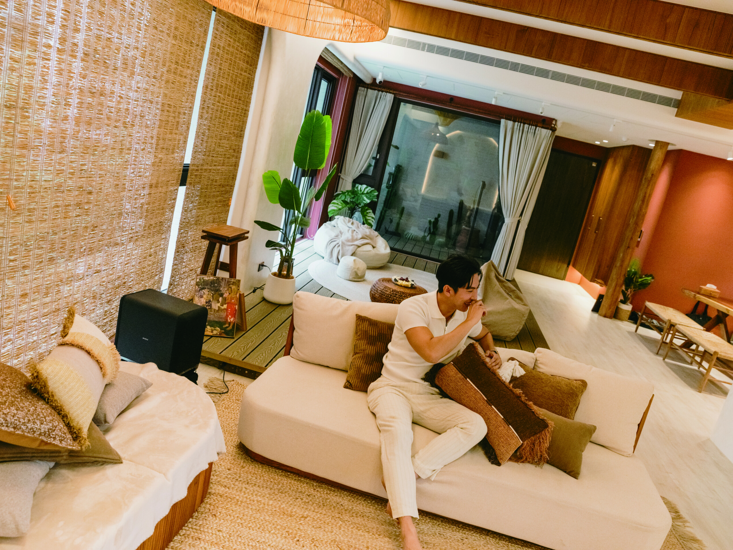 這份對真實樣貌的追求,也延伸到他對住宿空間的喜好。Aaron自家就有攝影棚出租,室內整體採度假風格。他喜歡帶家人入住德築的生活別墅,不只是因為建築設計或智能家電的便利,更因為那些小細節,手寫卡片、設計小物,讓人覺得溫度與巧思被融入生活。這些看似細微的安排,卻讓旅程有了不同的記憶與儀式感,就像是德築在生活場域中想傳遞的價值:不只是空間,更是人與生活之間的溫暖連結。