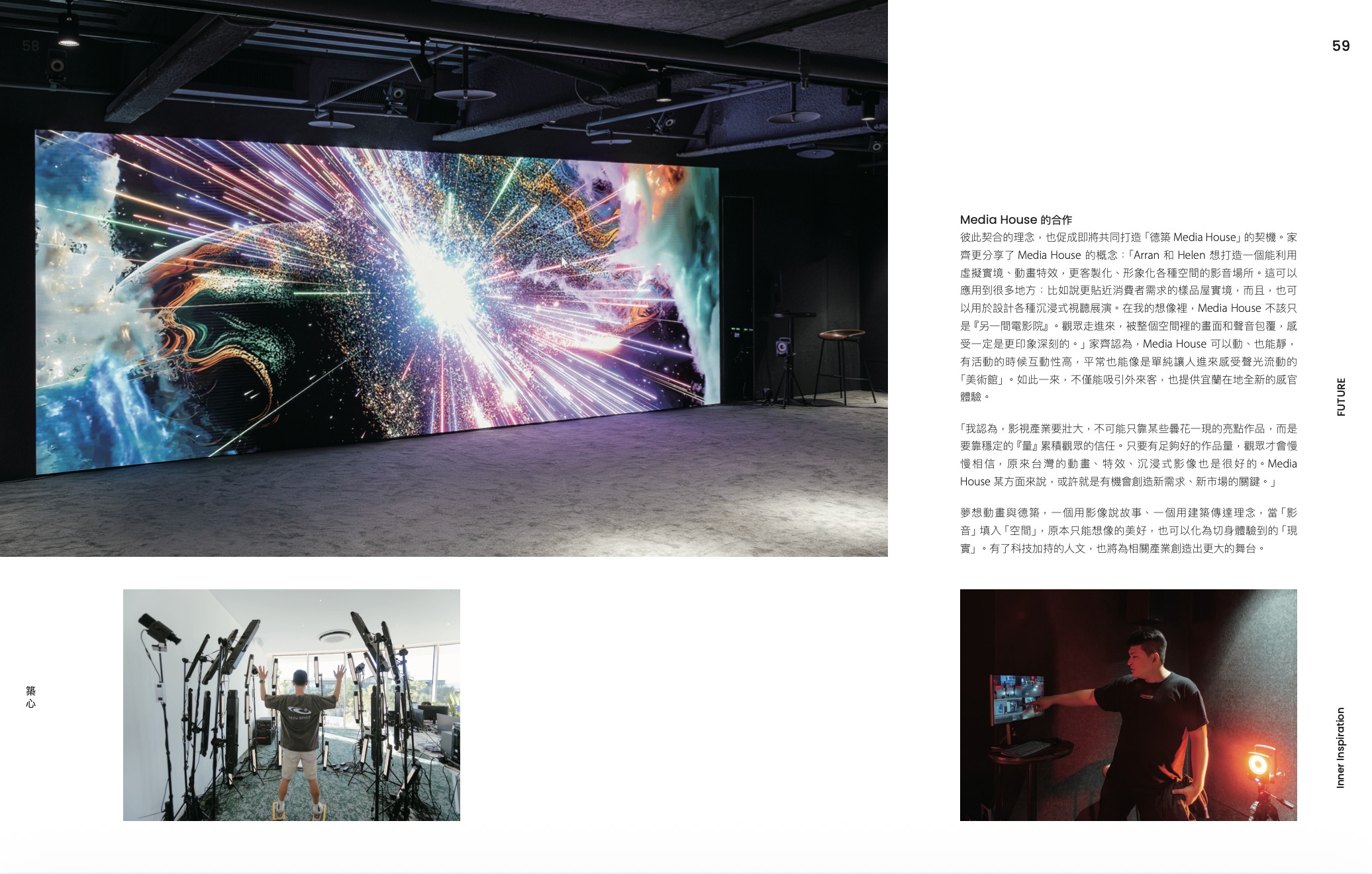 與德築的理念相呼應,家齊談到持續在跨領域做不一樣的事情,不只是科技,而是用沉浸式投影、互動展演,去說出未來的故事。他提到德築是很不一樣的建商,未來Media House蓋出來,也會是台灣第一個科技沉浸式體驗媒體空間。這樣的想像,也讓人不自覺聯想到拉斯維加斯的巨型球體投影或新媒體美術館的互動展出,不只是娛樂或展覽,而是一種嶄新的敘事方式。