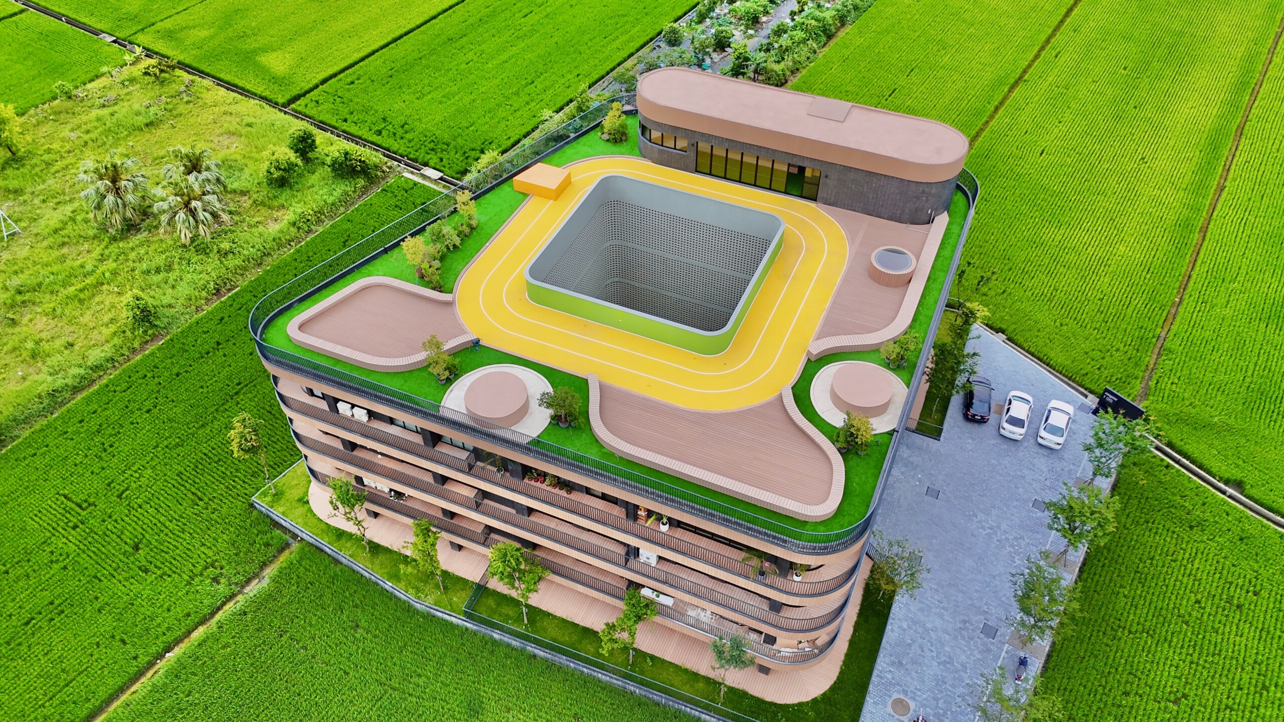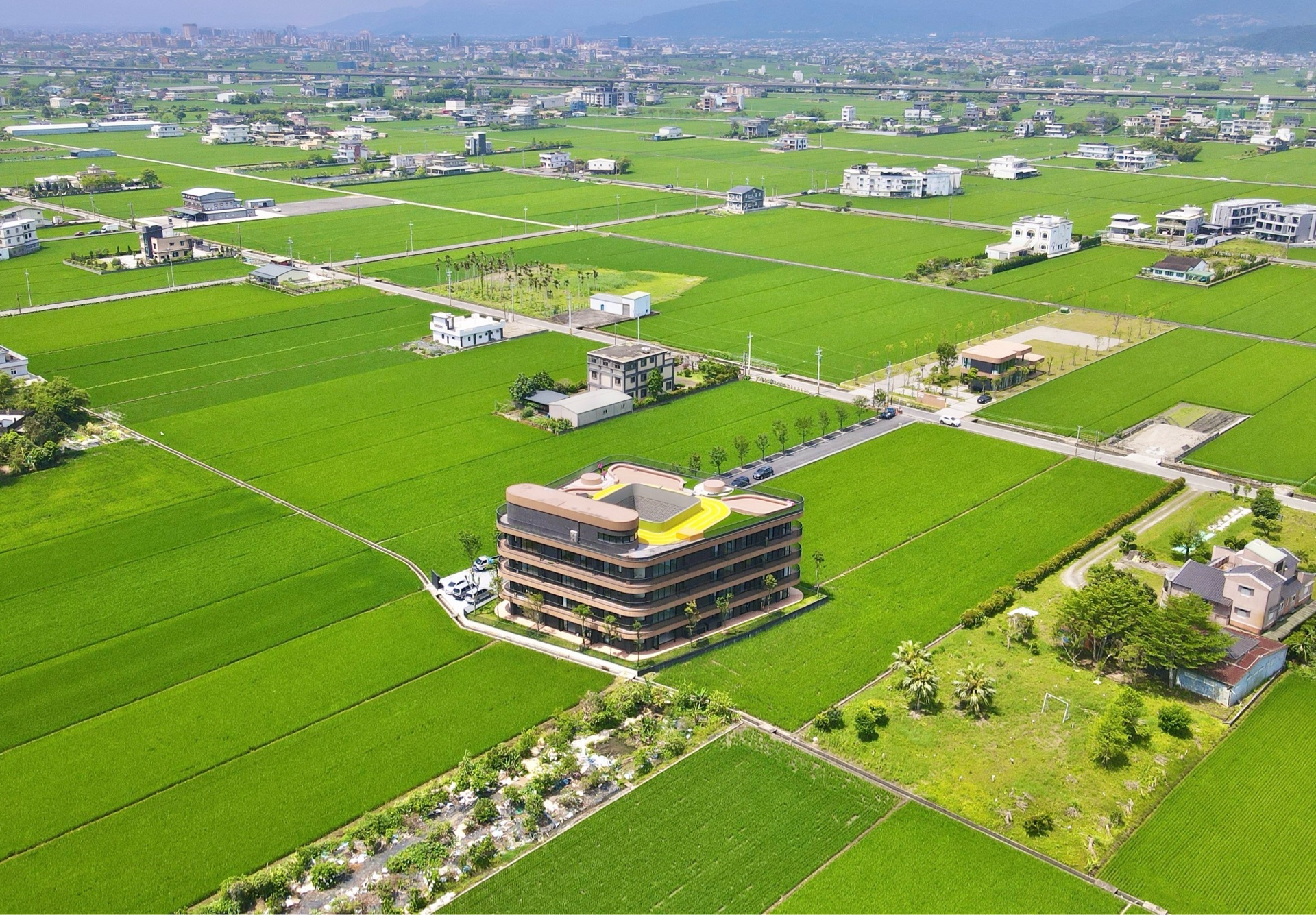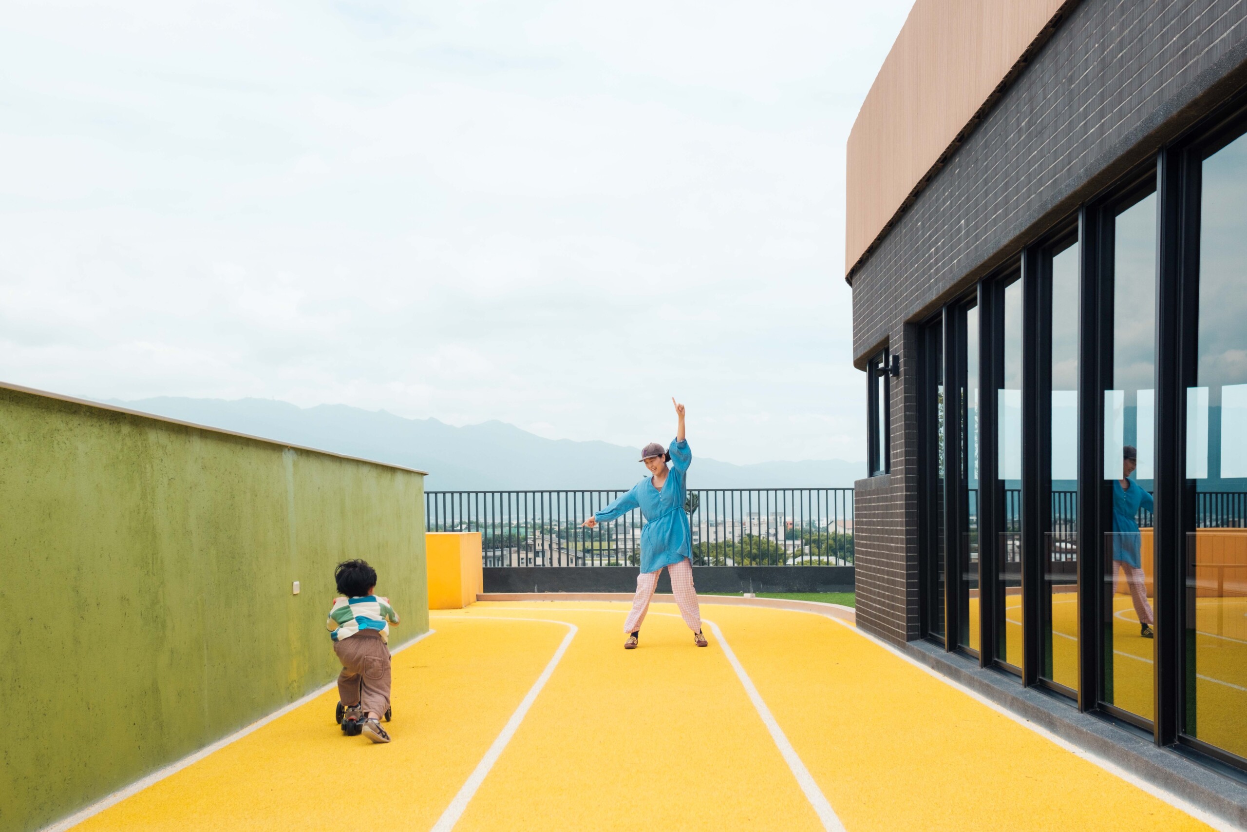 為了讓宜蘭最美風光盡收眼底,築山在公共空間設計上處處盡顯巧思,屋頂平台設計彷如活在山林之中,在種滿植栽綠樹的開放空間裡,既可露營、野餐,也可以在晚餐飯後與家人一起登上屋頂平台細賞夜空繁星,甚至穿上慢跑鞋在屋頂的森林跑道悠遊暢跑,全然地拋開工作繁忙的壓力與緊繃;隨時可見的綠色風景,包括宜蘭一年一耕的稻田變化、日出日落的天空美景、遠方山脈層層相疊的詩意,社區附近更適合愜意散步跟慢跑、騎車兜風吹涼風,甚至是在陽光下洗車溜狗,這些不用出國就能在家裡欣賞品茗的景色,教人待在家裡就不想出門,一整天感受到大自然的生命力。