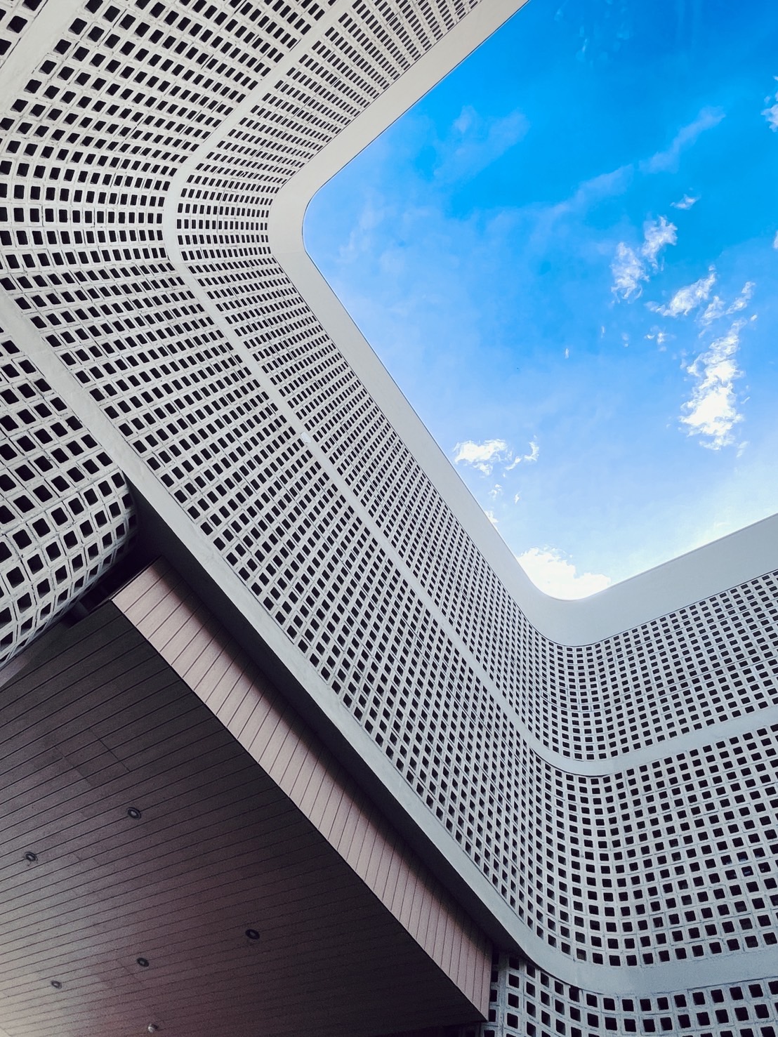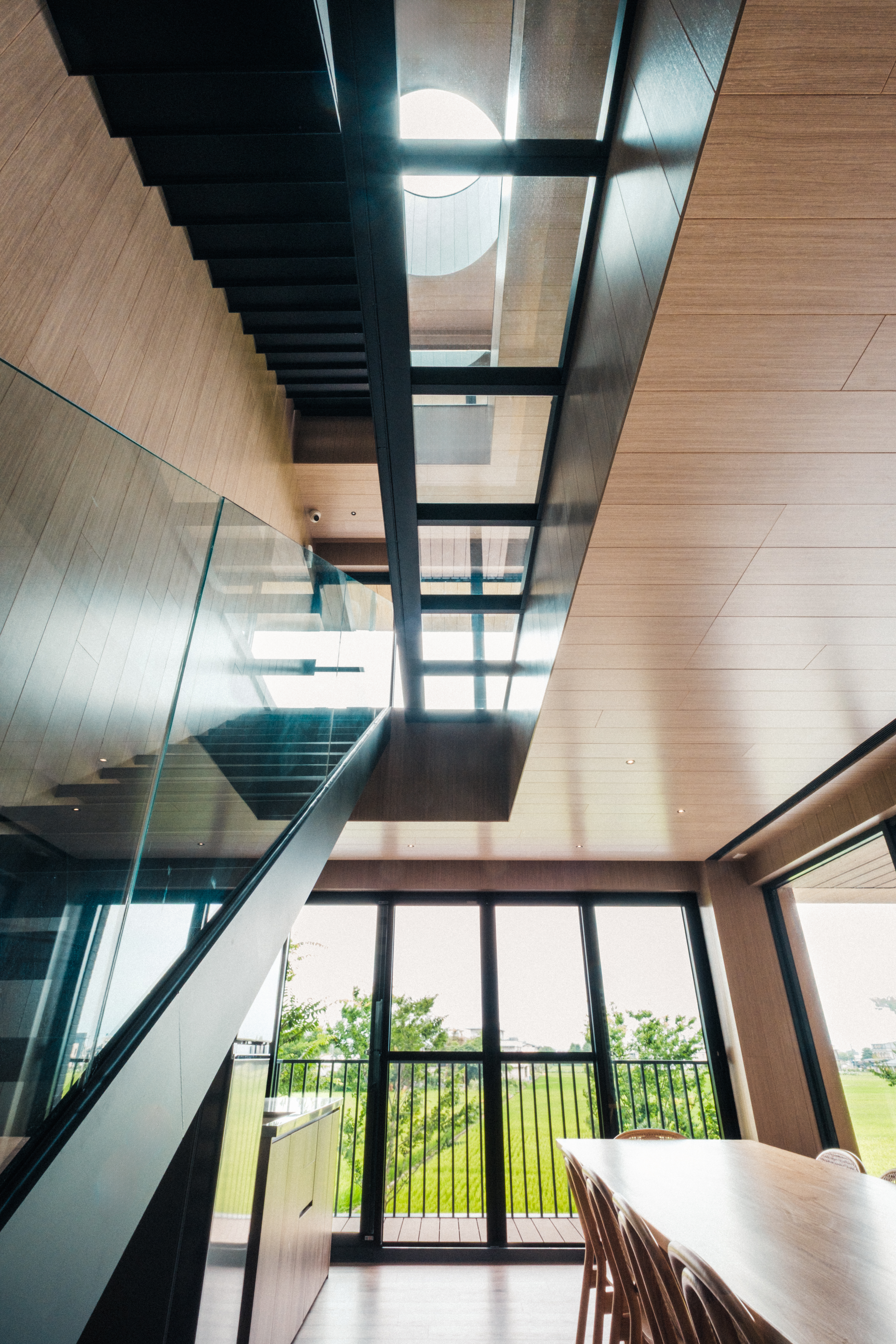 ©從一樓入口就能看到四層樓高的天井設計,自然風與陽光流動,讓住戶在公共空間擁有與居家完全不同的尺度。