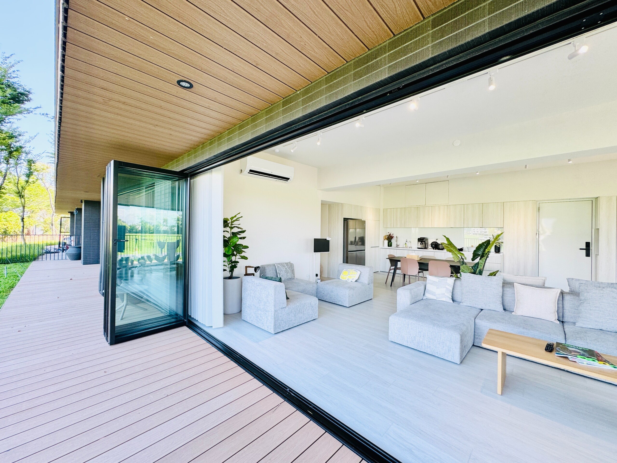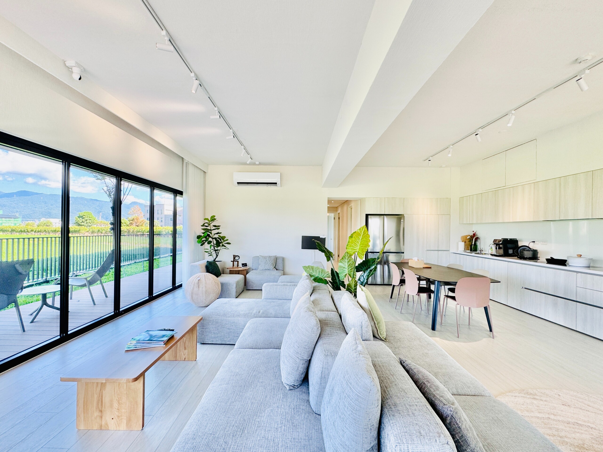 ©簡約舒適的室內設計襯托著室外自然美景,開放式空間規劃讓住戶隨著生活需求變化更動家具位置。