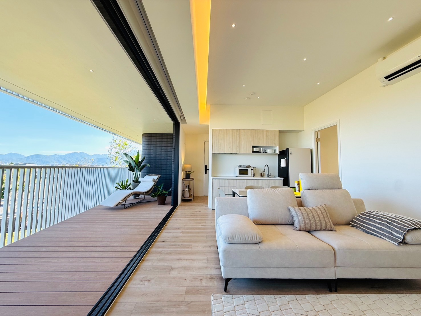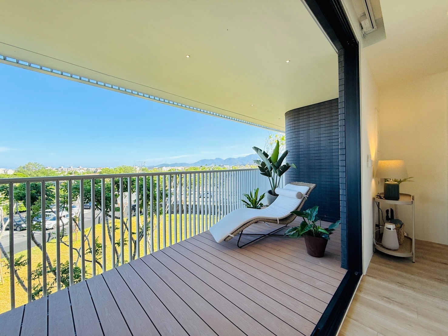 ©挑高3.5米的開闊尺度,大落地窗引景入內,陽台質感木紋更自然延伸到室內,這就是築水帶來最貼近自然的生活樣貌。