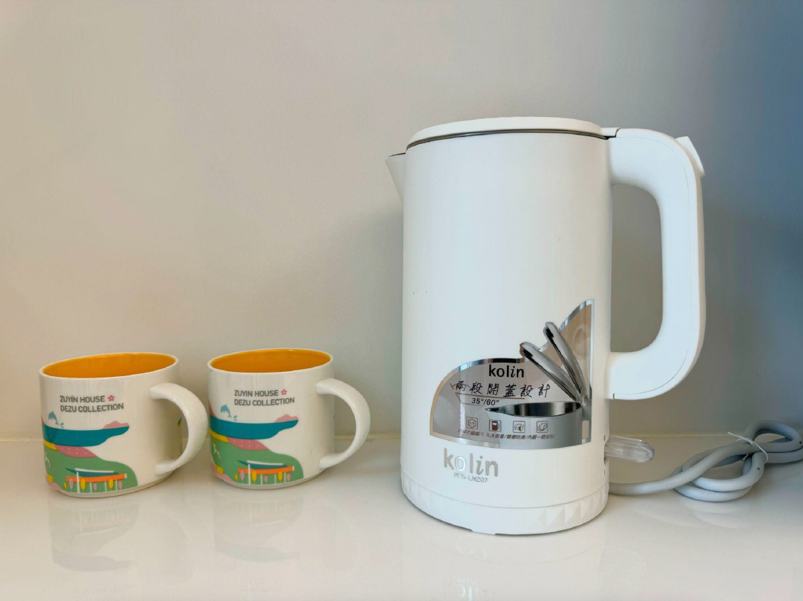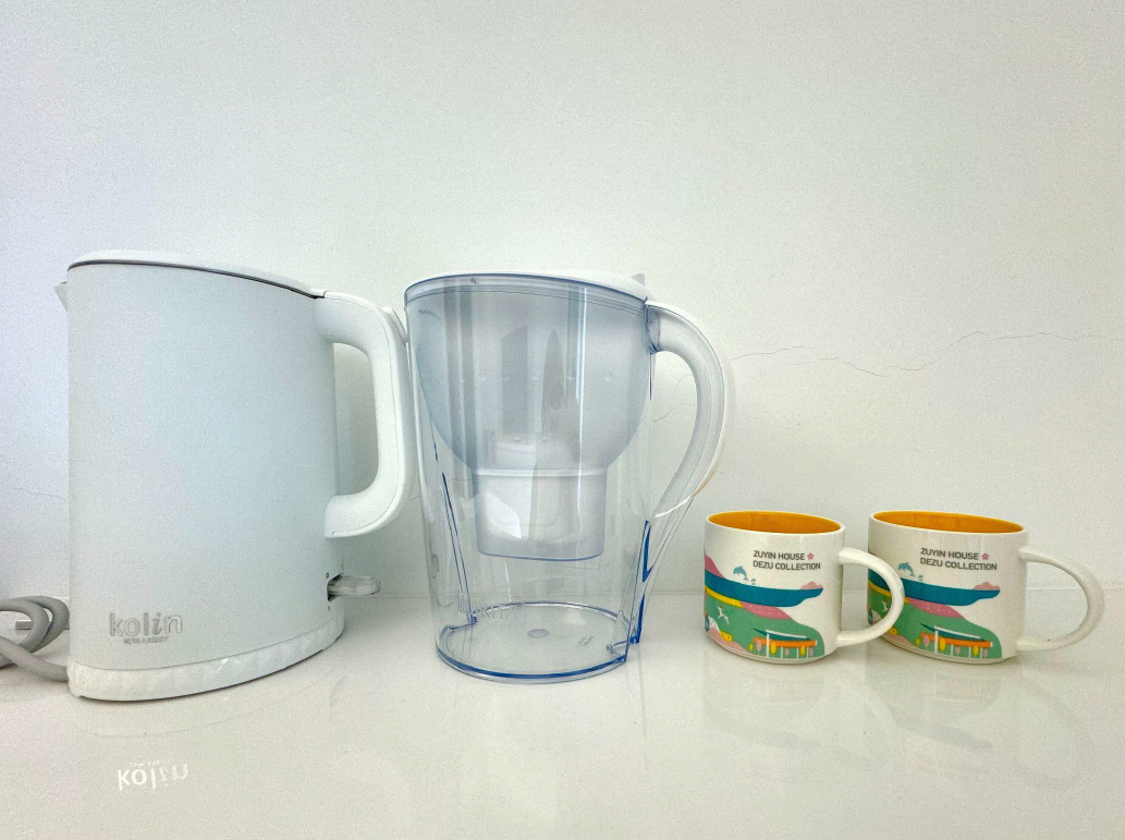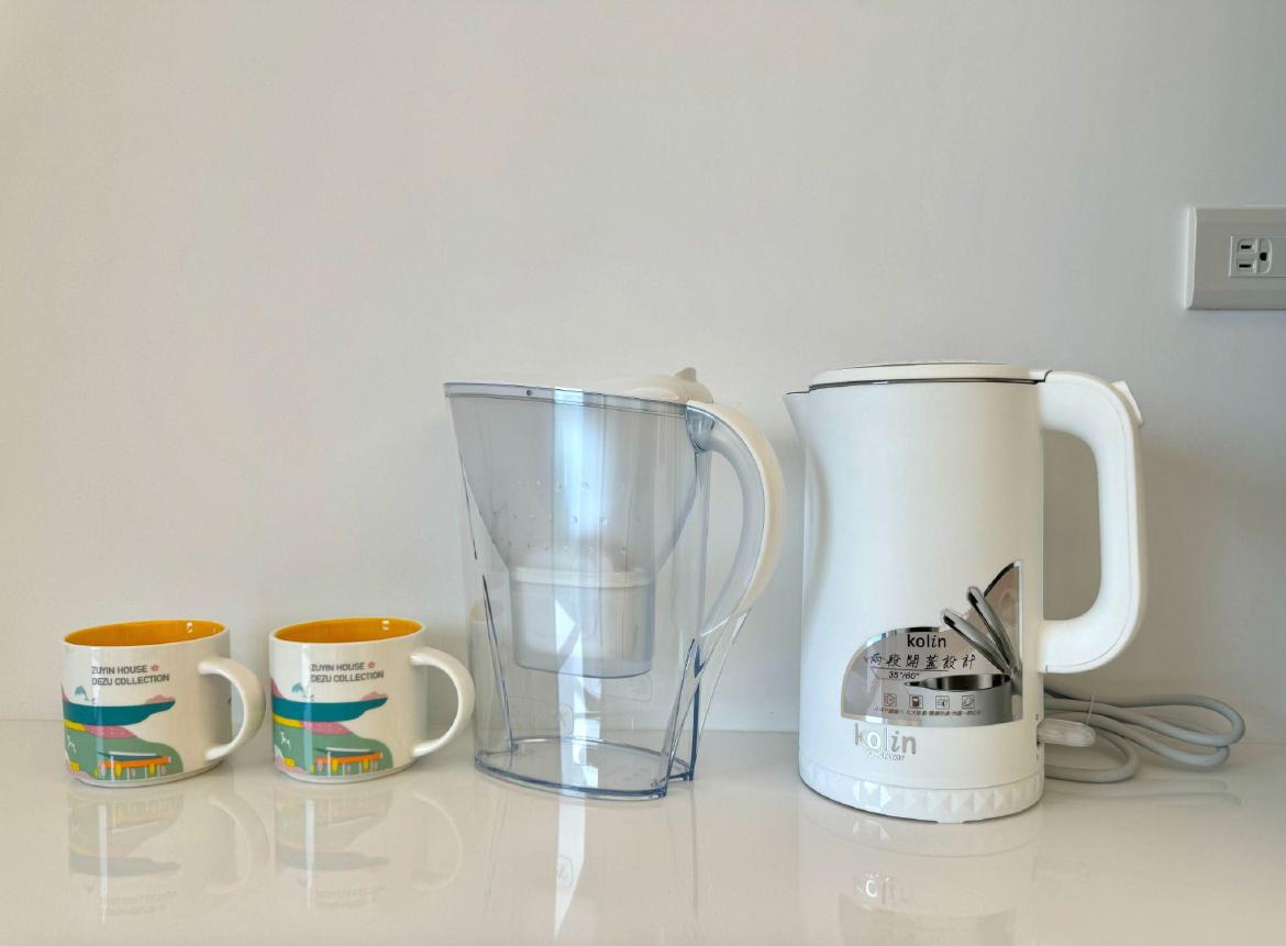 ©️臥室桌面上有濾水壺、快煮壺,吹風機位於衛浴檯面上。