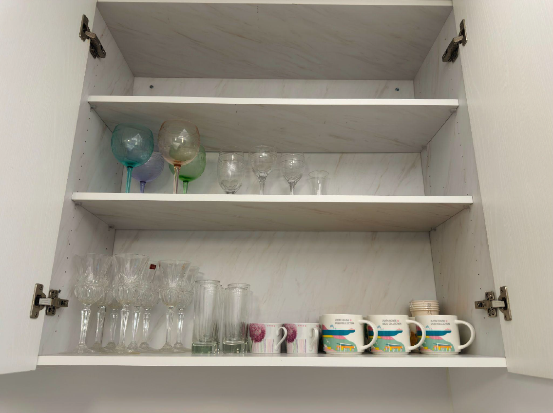 ©️紅酒杯、馬克杯、玻璃杯位於廚房上方櫃內。